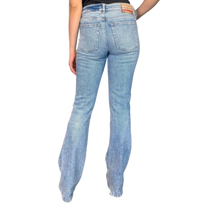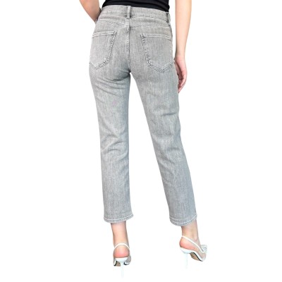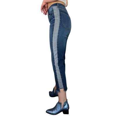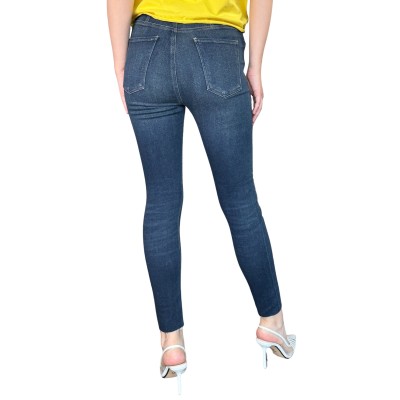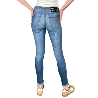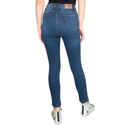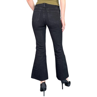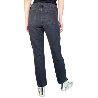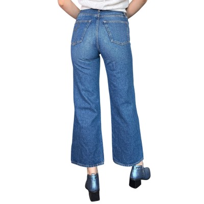 Jeans Marine de tiro alto, pierna ancha con basta desflecada. Cierre y botón metálicos. Tres presillas de cinturón. Elasticados.
